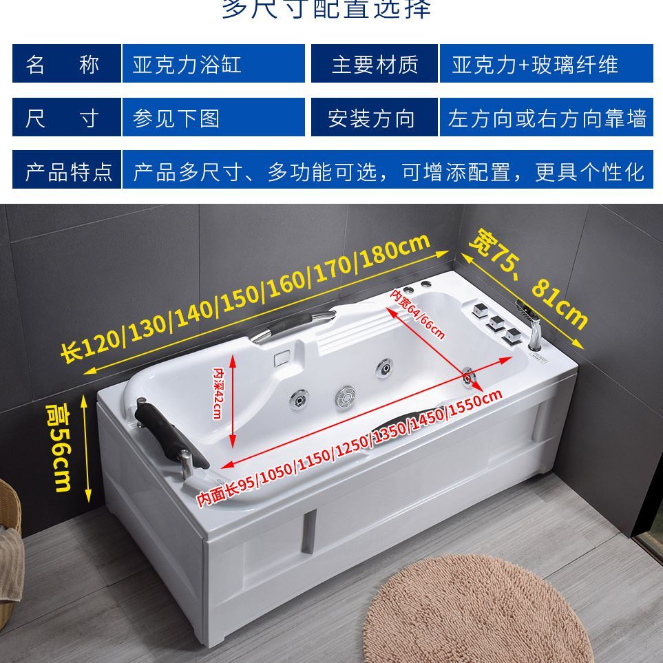 智能冲浪按摩浴缸亚克力家用小户型浴池迷你成人恒温单人浴盆方形