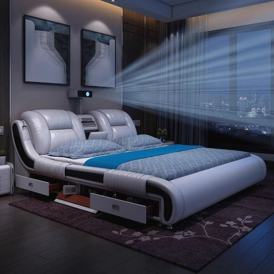 【投影仪】真皮床1.8米牛皮主卧现代智能储物床双人多功能投影仪