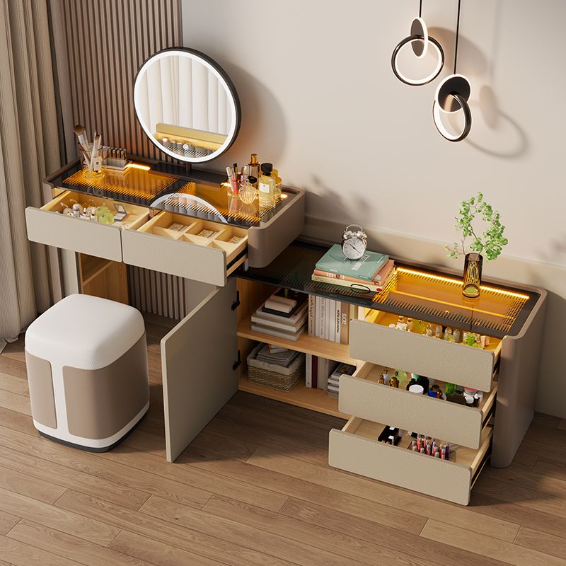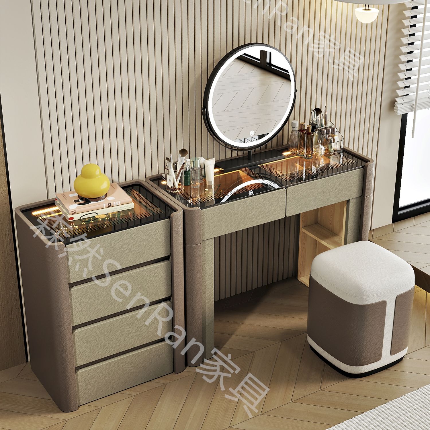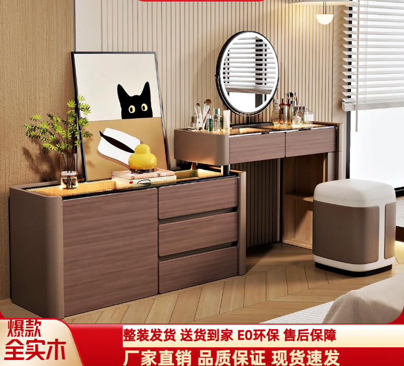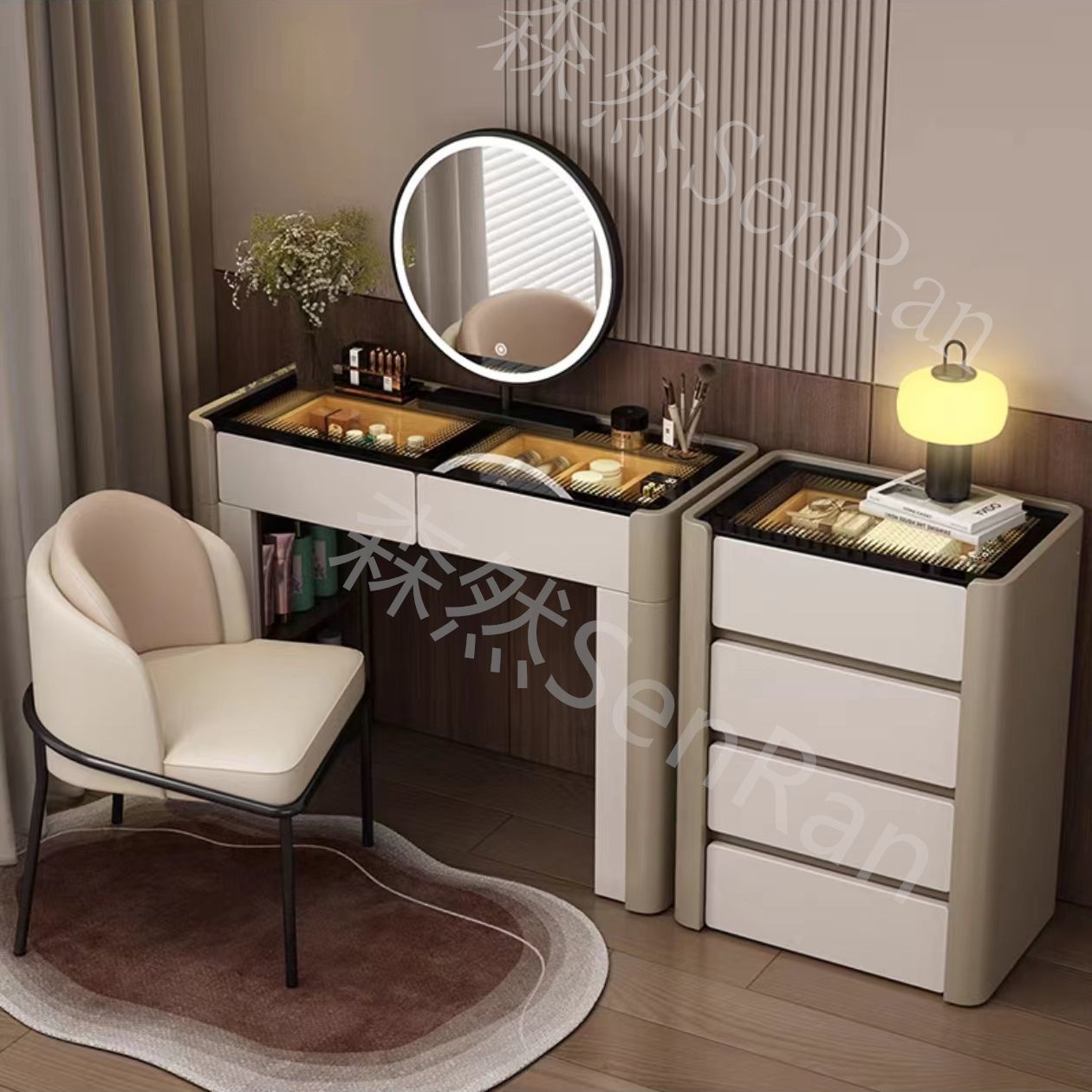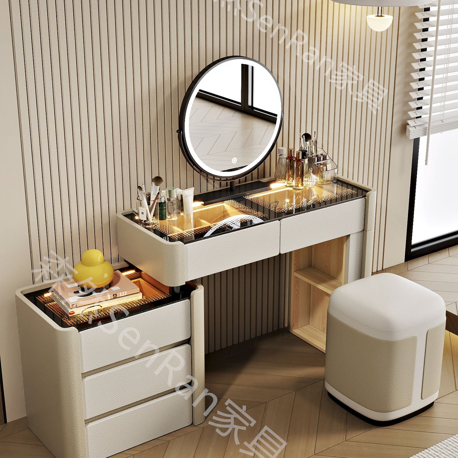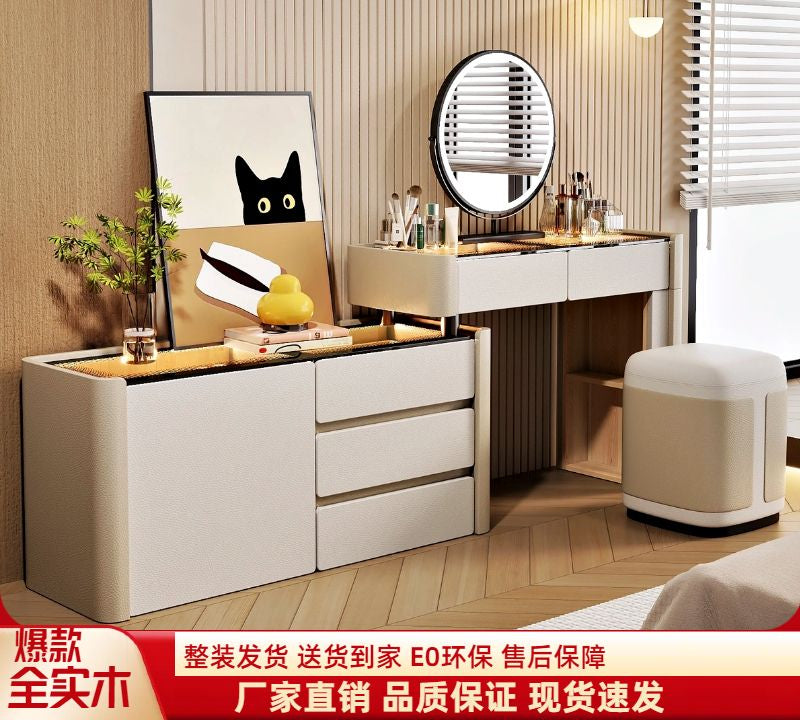 奶油风卧室实木梳妆台带氛围灯现代简约斗柜一体式伸缩转角化妆桌