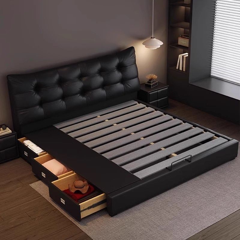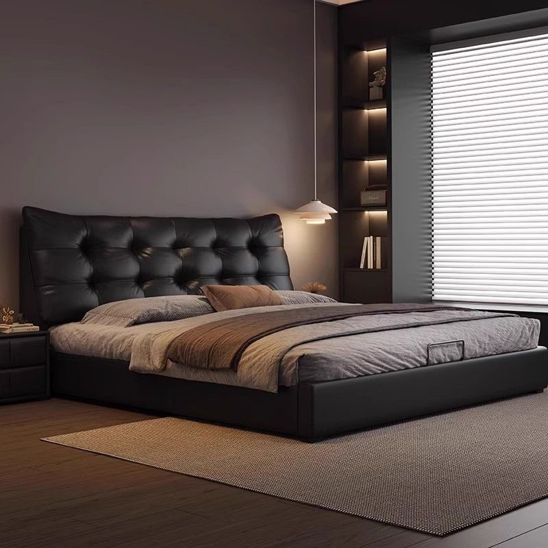 意式极简现代真皮双人床轻奢风高端大气主卧家用储物大床黑色婚床