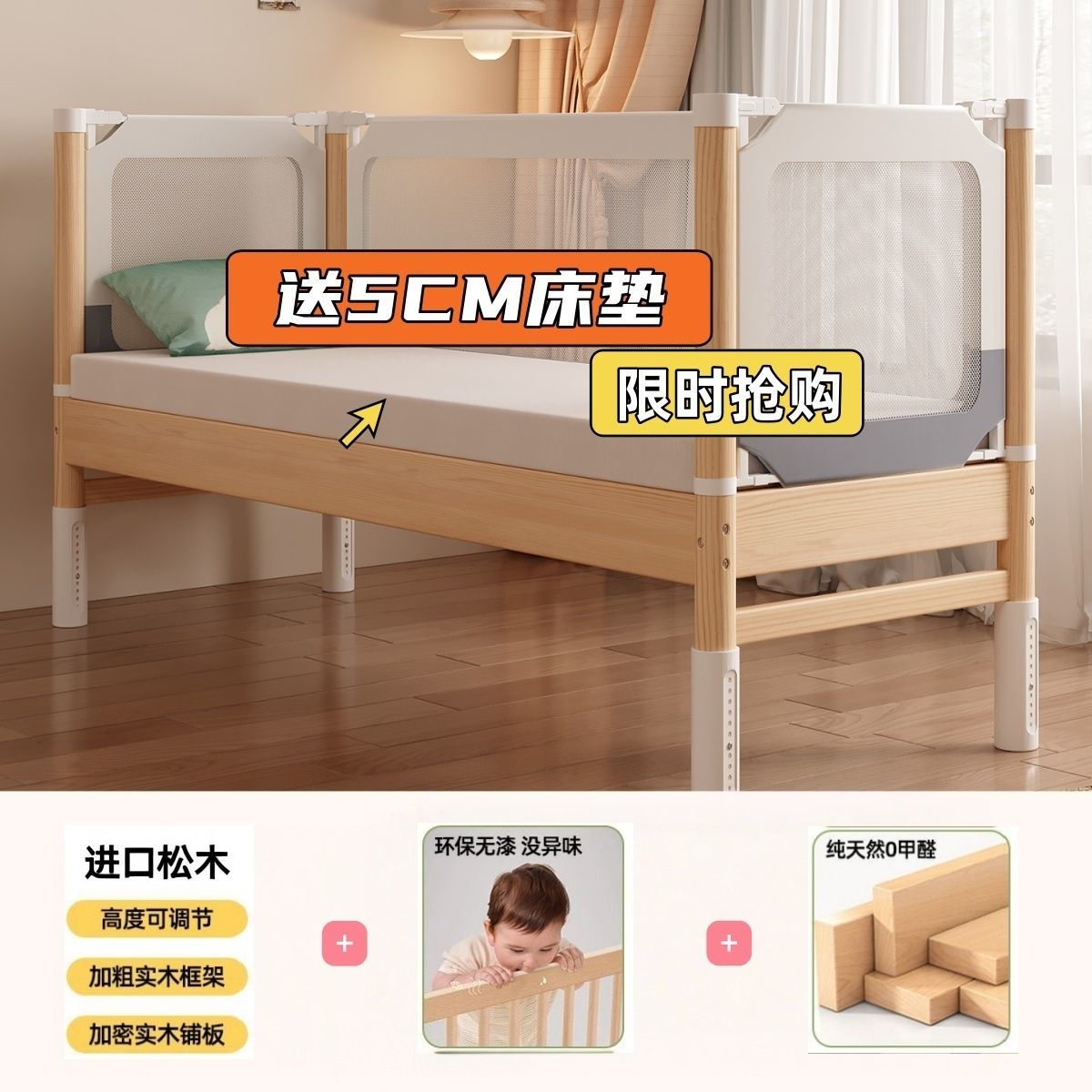 榉木拼接床婴儿床实木加宽床边平接大床无缝可升降护栏宝宝儿童床