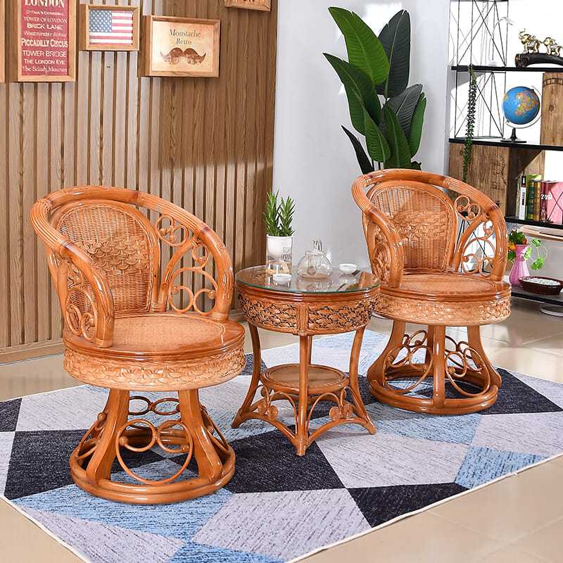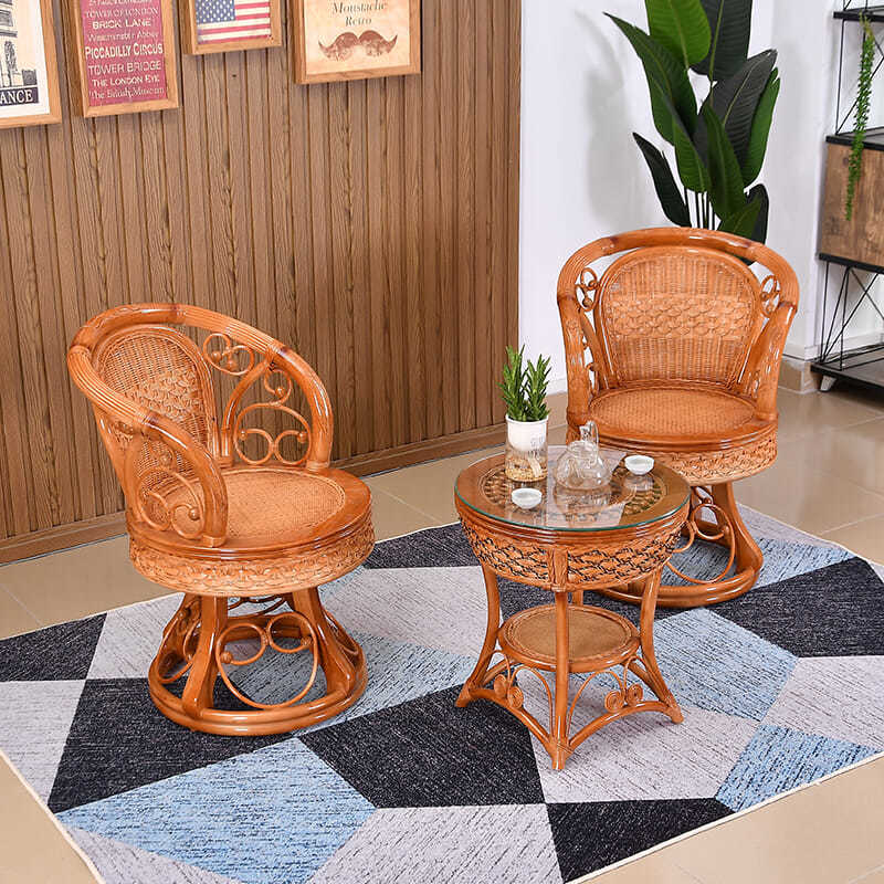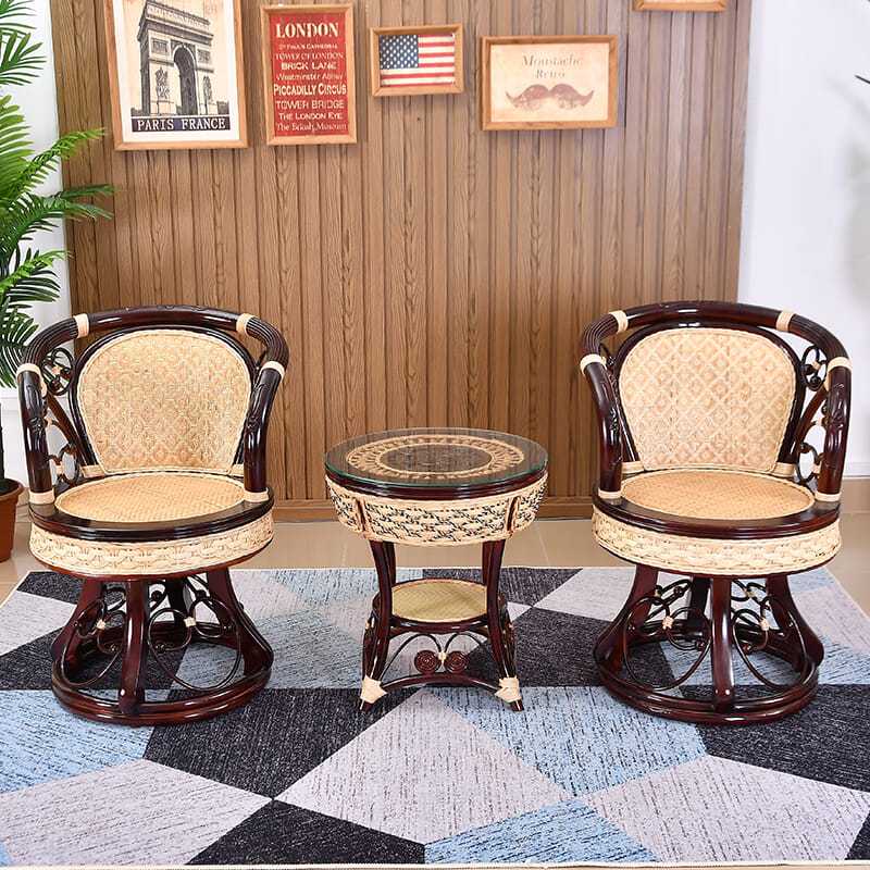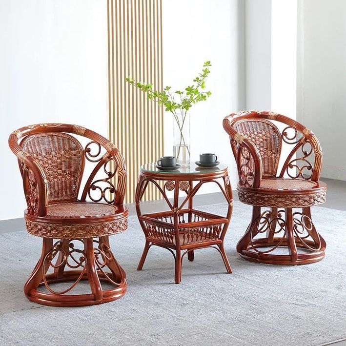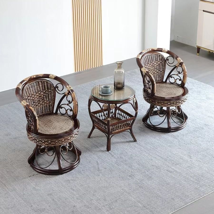 真藤椅子三件套阳台桌椅组合室内实木靠背单人休闲小腾椅旋转藤椅