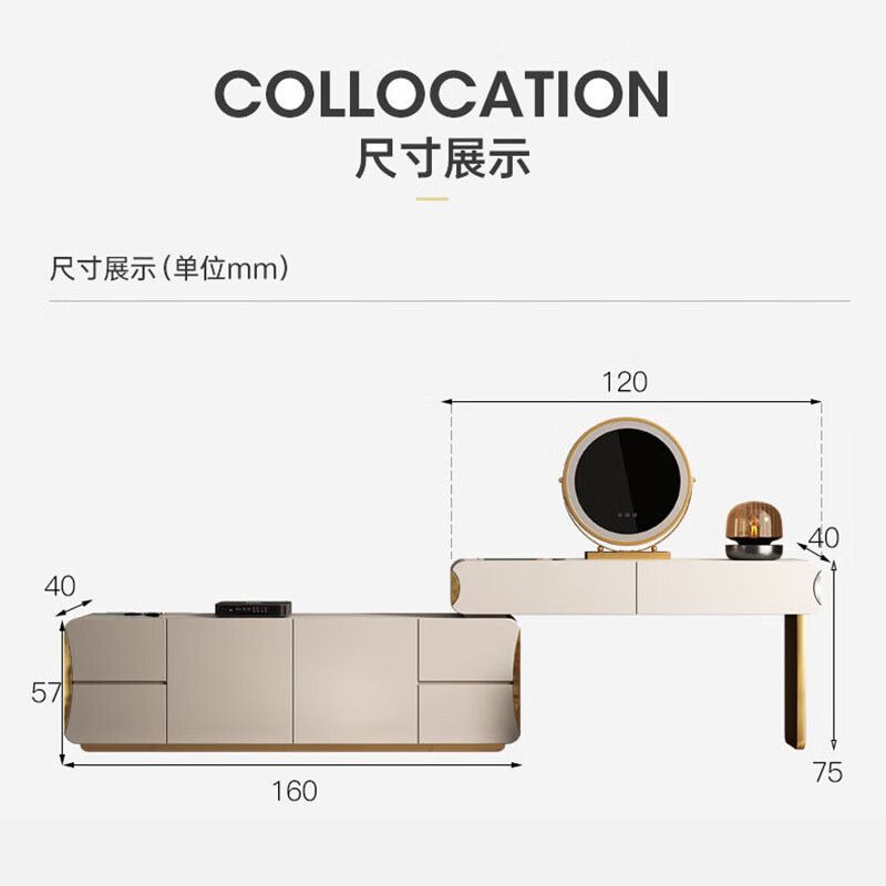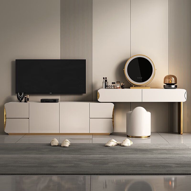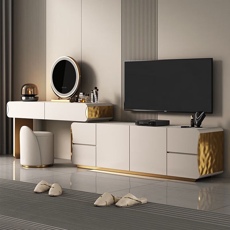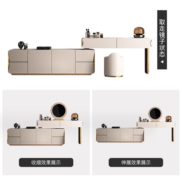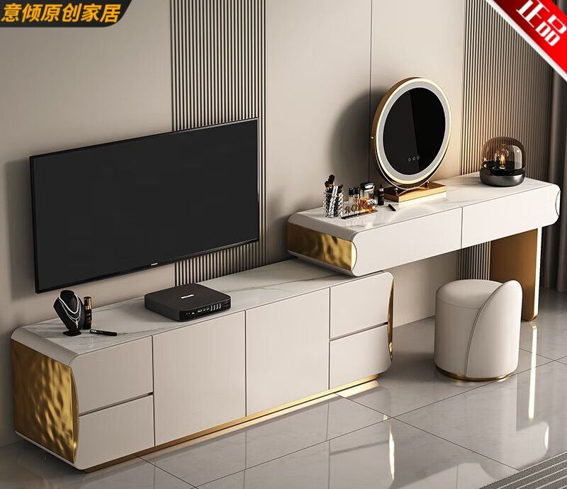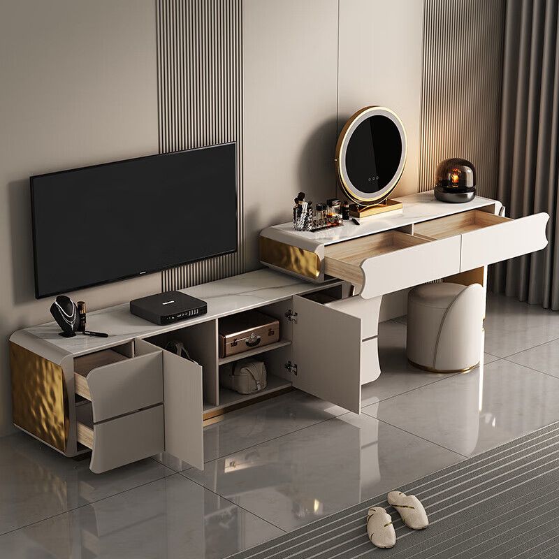 轻奢卧室实木梳妆台收纳电视柜一体岩板床尾可伸缩高端大气化妆桌