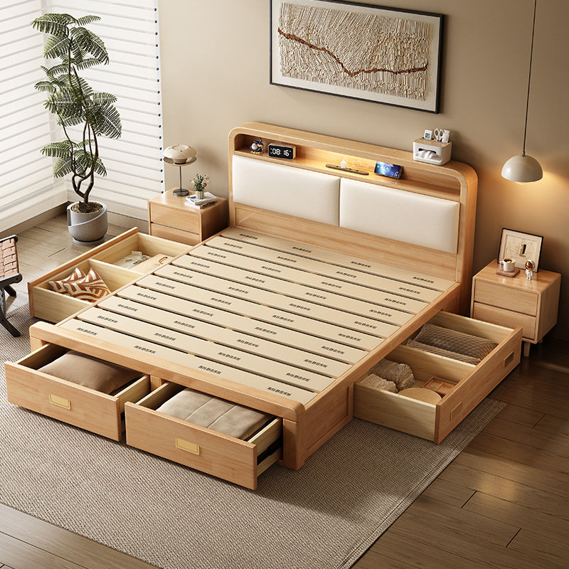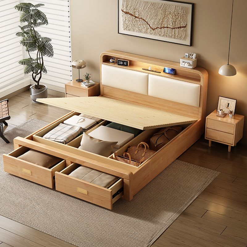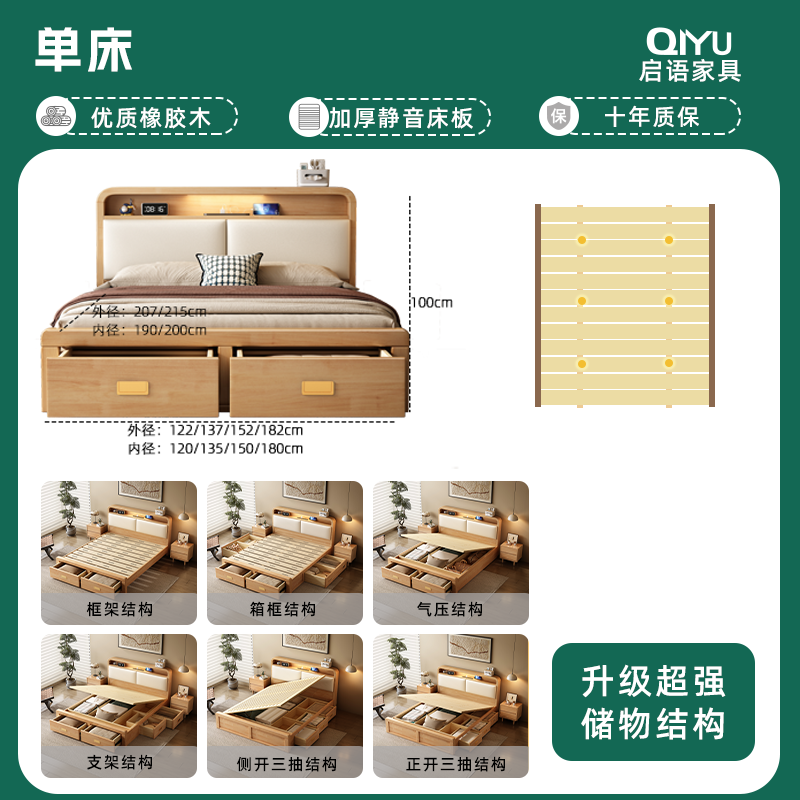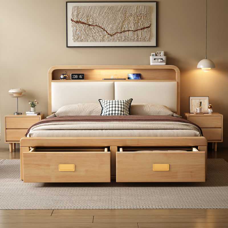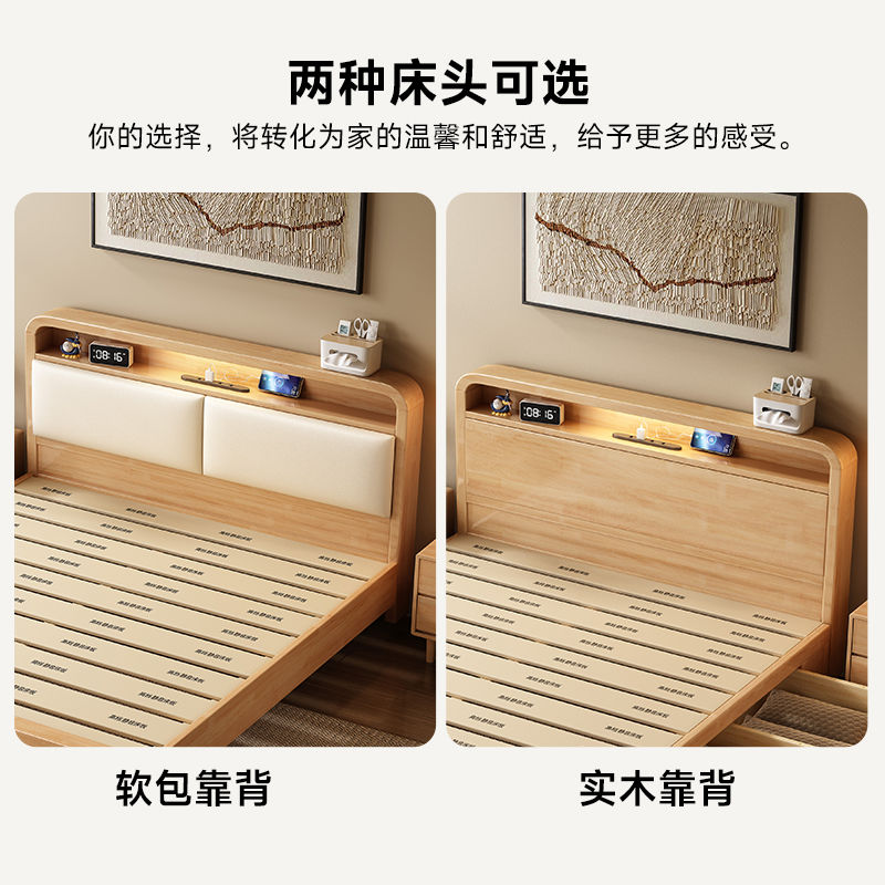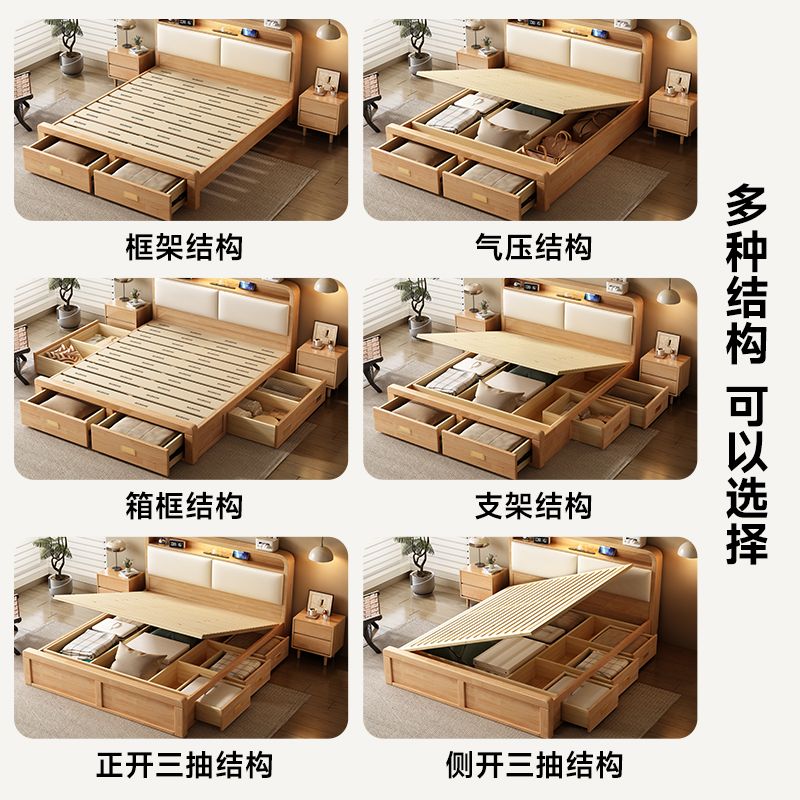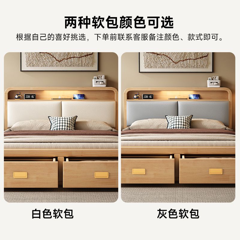 北欧实木床1.8M简约带抽屉夜灯软包气压高箱储物床1.2米中小户型