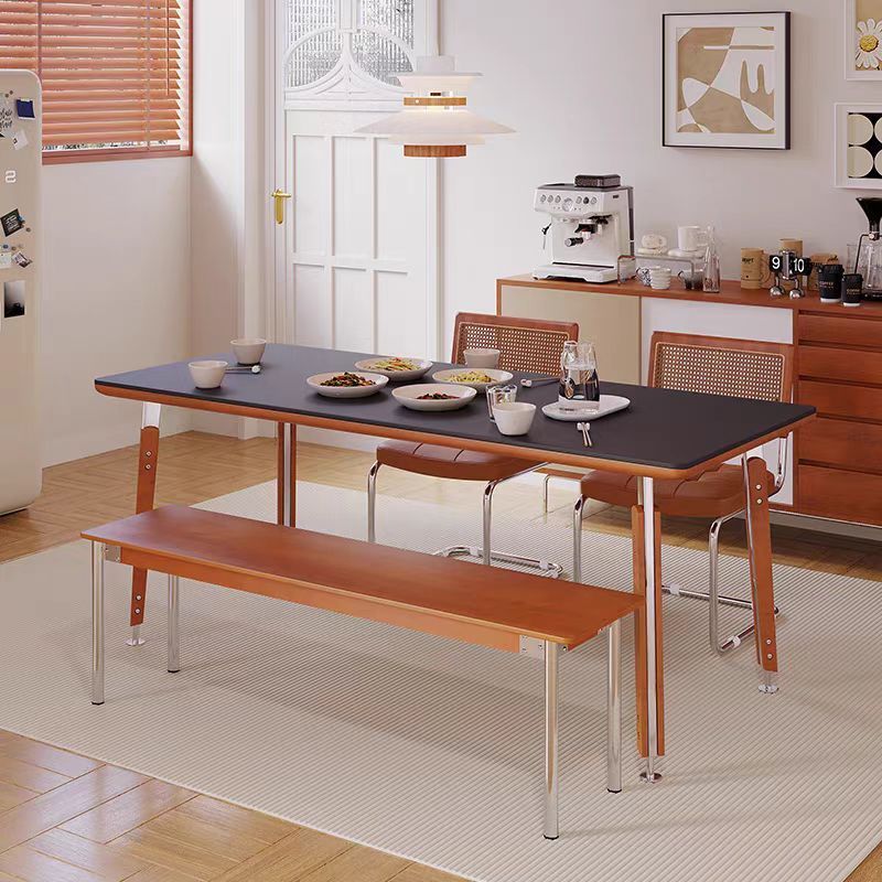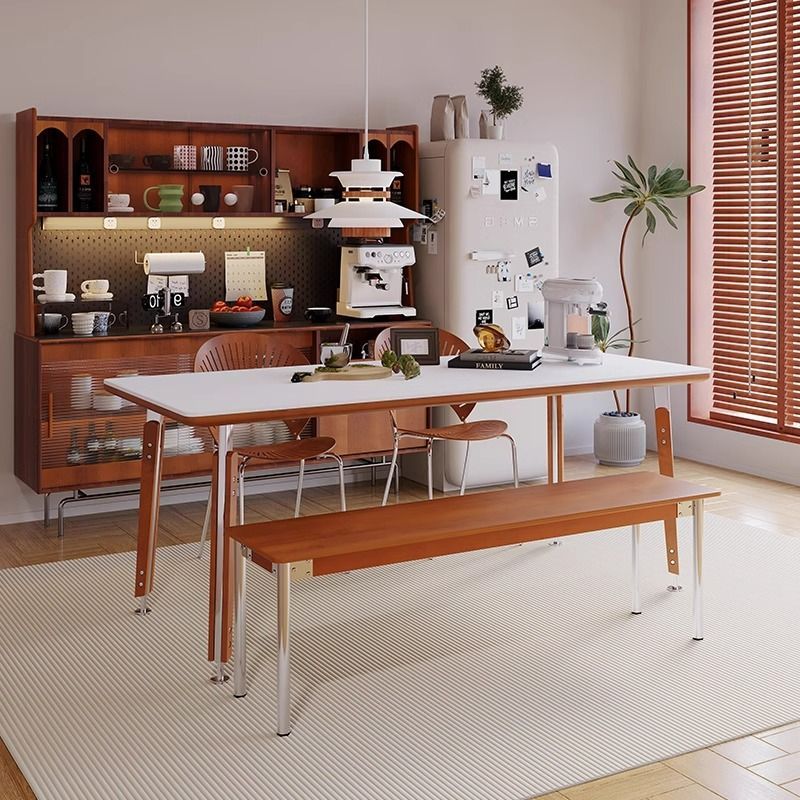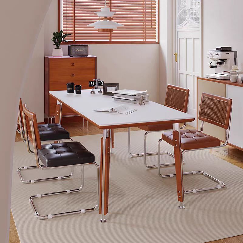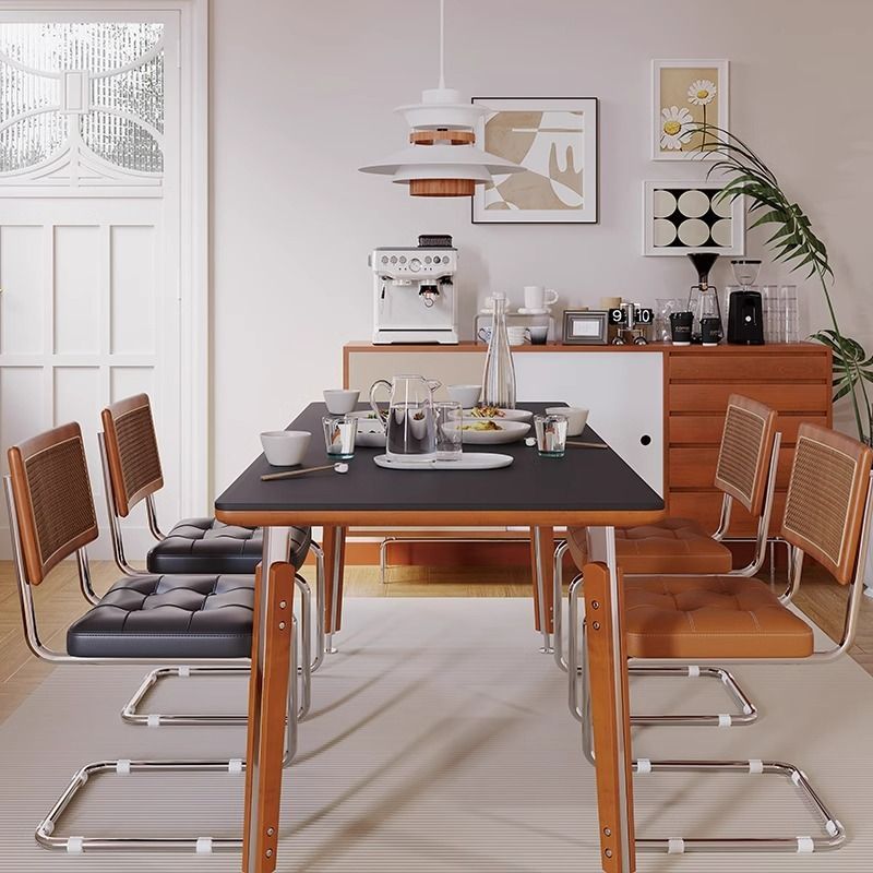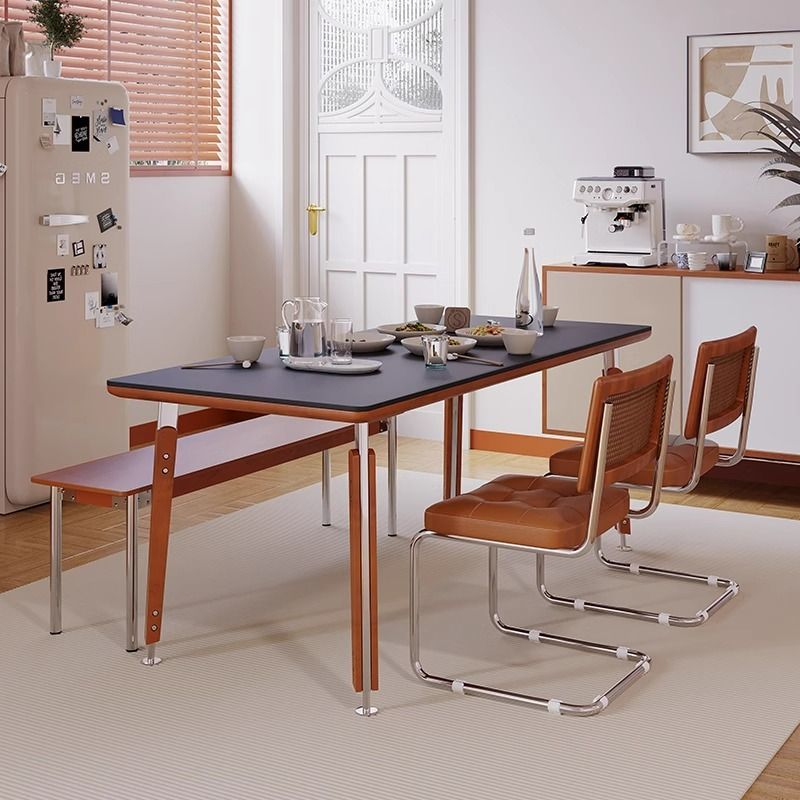 复古实木岩板餐桌意式纯白纯黑小户型长桌家用饭桌金属腿中古家具