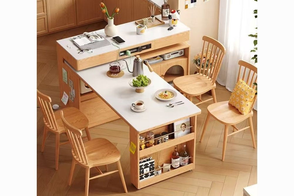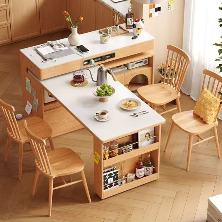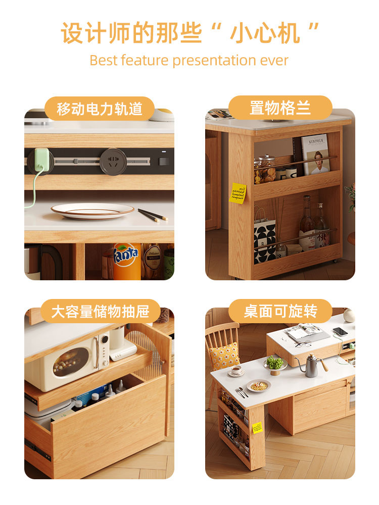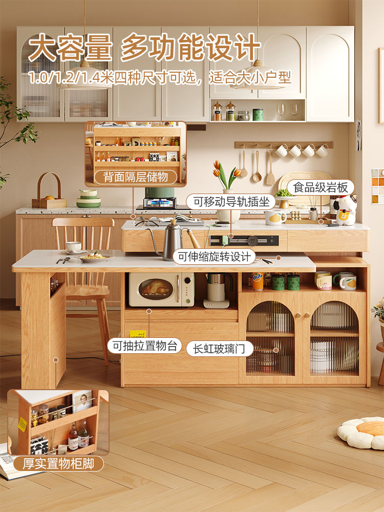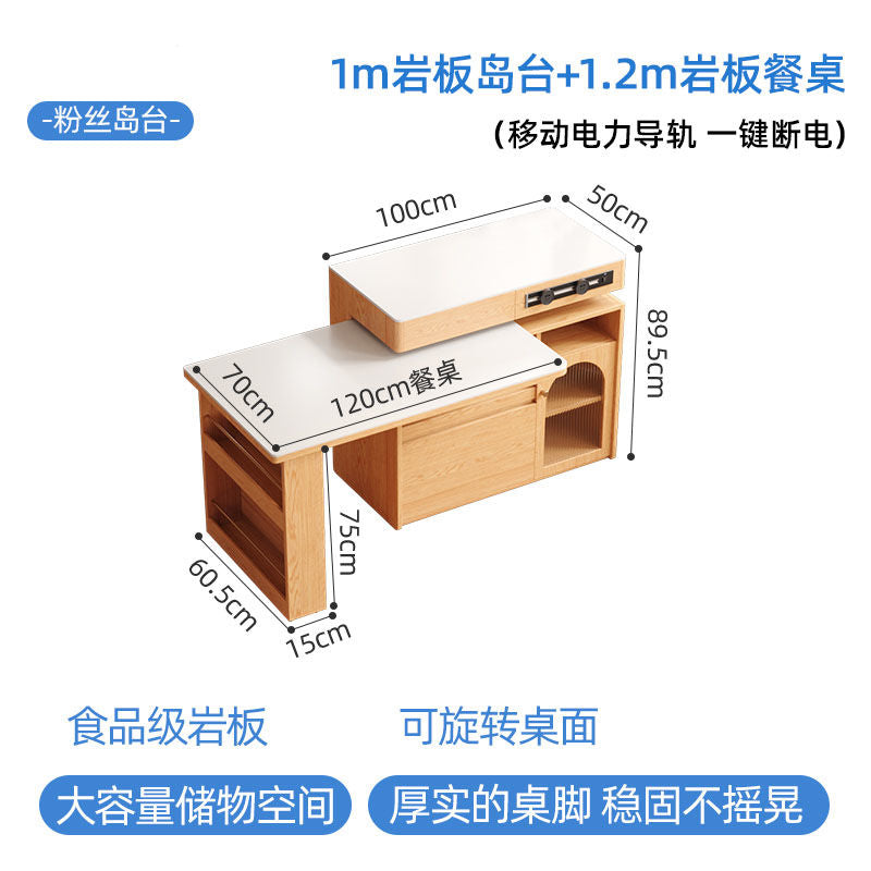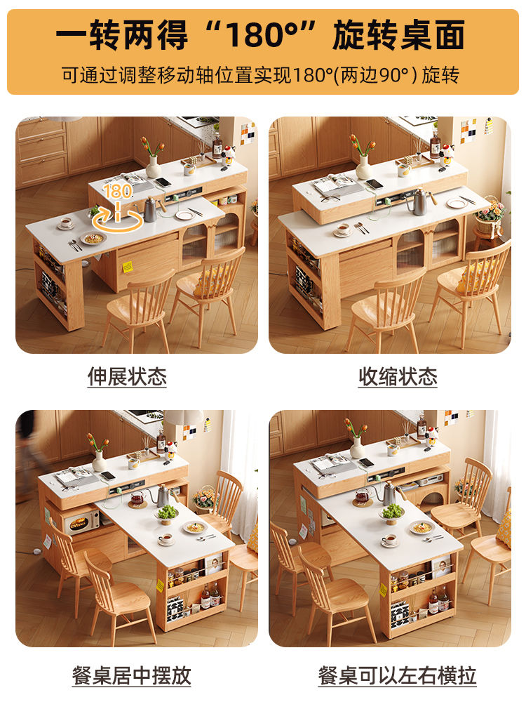 小户型实木岛台伸缩餐桌一体家用原木奶油风岩板旋转多功能吧台桌