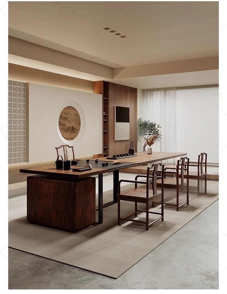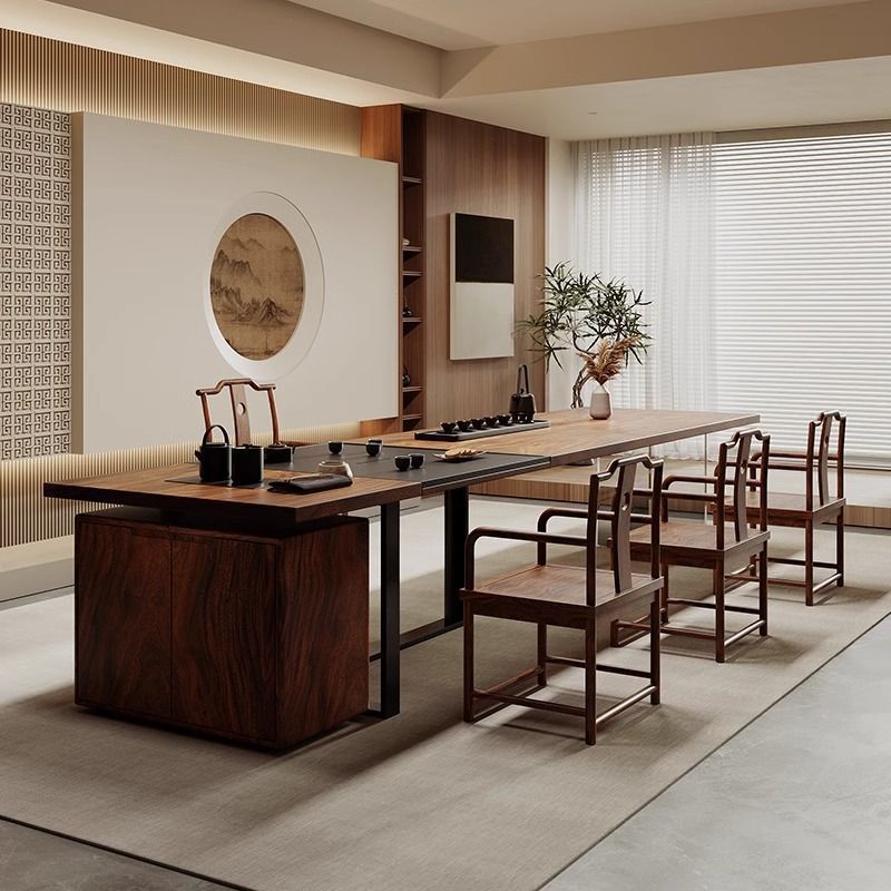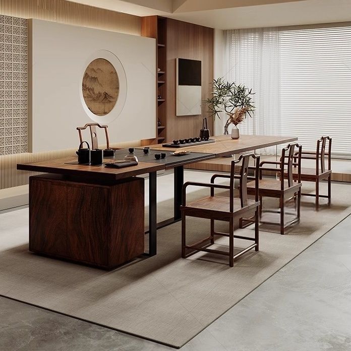 台灣公司魯班傢俱行歡迎您。註冊統編60015967 南美胡桃木茶桌新中式豪华实木茶台一整套黑胡桃木意式轻奢茶桌椅